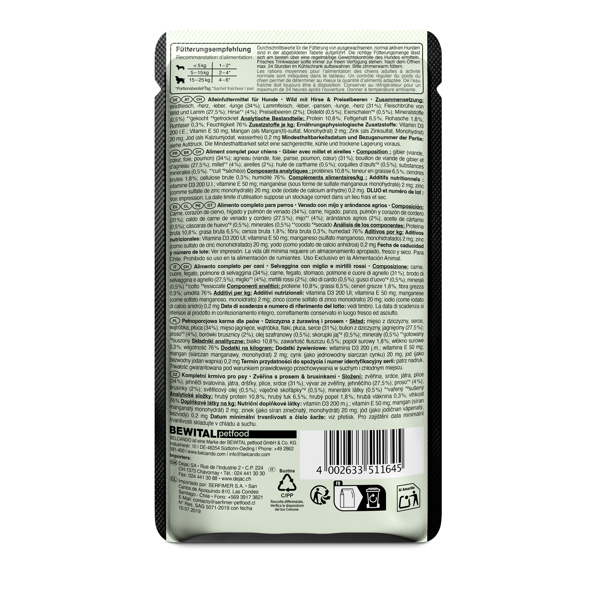 Zusammensetzung Wildfleisch, -herz, -leber, -lunge (34 %); Lammfleisch, -leber, -pansen, -lunge, -herz (31 %); Fleischbrühe von Wild und Lamm (27,5 %); Hirse*¹ (4 %); Preiselbeeren (2 %); Distelöl (0,5 %); Eierschalen*² (0,5 %); Mineralstoffe (0,5 %) *¹gekocht *²getrocknet