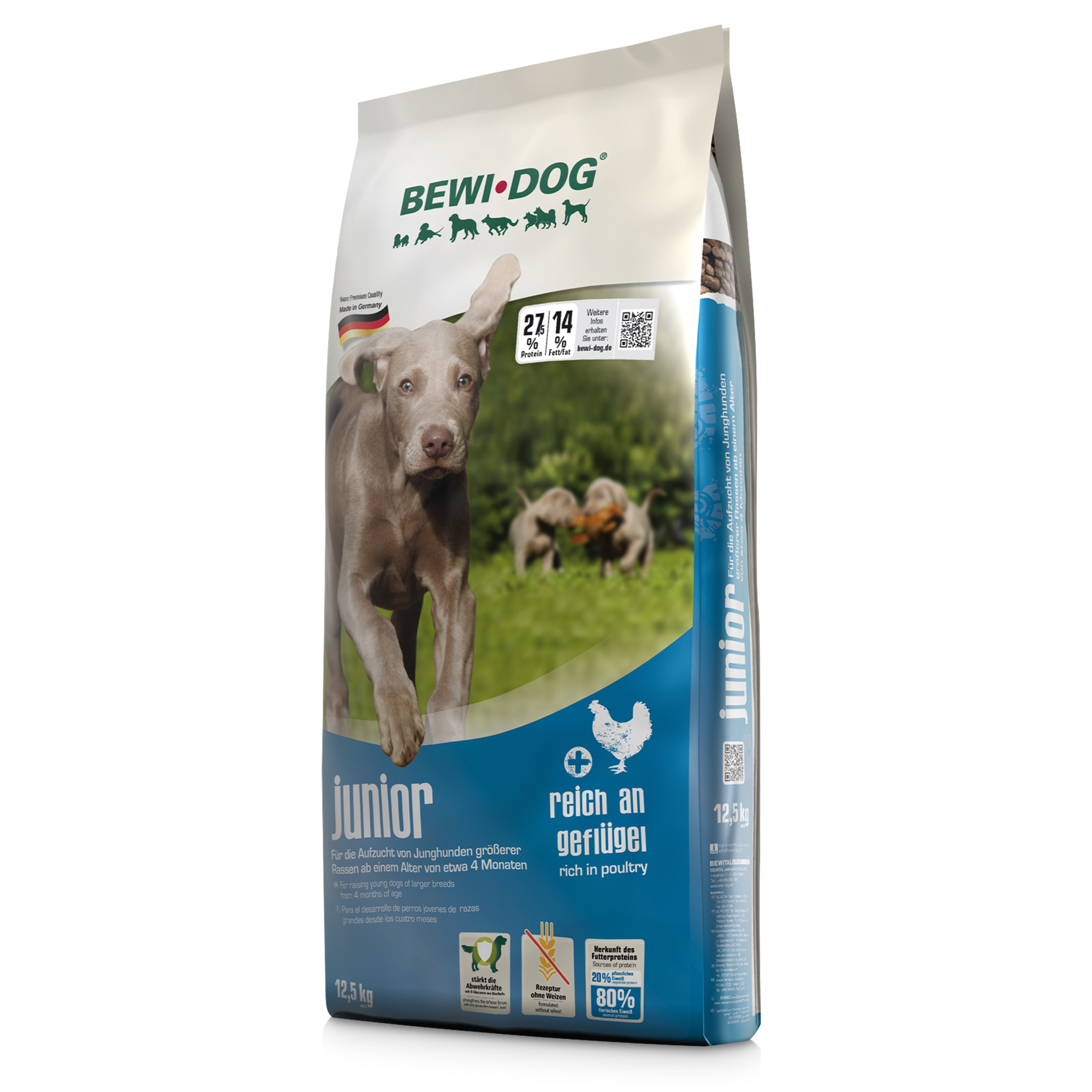 BEWI DOG® junior ist mit einem gemäßigten Protein- und Energiegehalt speziell auf die Fütterung von Junghunden großer Rassen abgestimmt. Leicht verdauliche, erstklassige Rohstoffe mit optimaler Proteinqualität ermöglichen ein gleichmäßiges, moderates Wachstum. Der Zusatz an speziellen Hefe-Verbindungen (Beta-Glucane) stimuliert die körpereigene Immunabwehr. Dies hilft die Gefahr von Infekten in der empfindlichen Wachstumsphase zu reduzieren. Eine wohl dosierte Menge an Mineralstoffen und Vitaminen sowie Lecithin und Bierhefe sind weitere Komponenten des einzigartigen BEWI DOG® Vitalkomplexes. Dieser liefert dem Junghund eine sinnvolle Nährstoffergänzung, die weit über ein gewöhnliches Futter hinausgeht. Ein stabiler Knochenbau, eine kräftige Muskulatur und Vitalität sind das Resultat der Aufzucht mit BEWI DOG® junior.